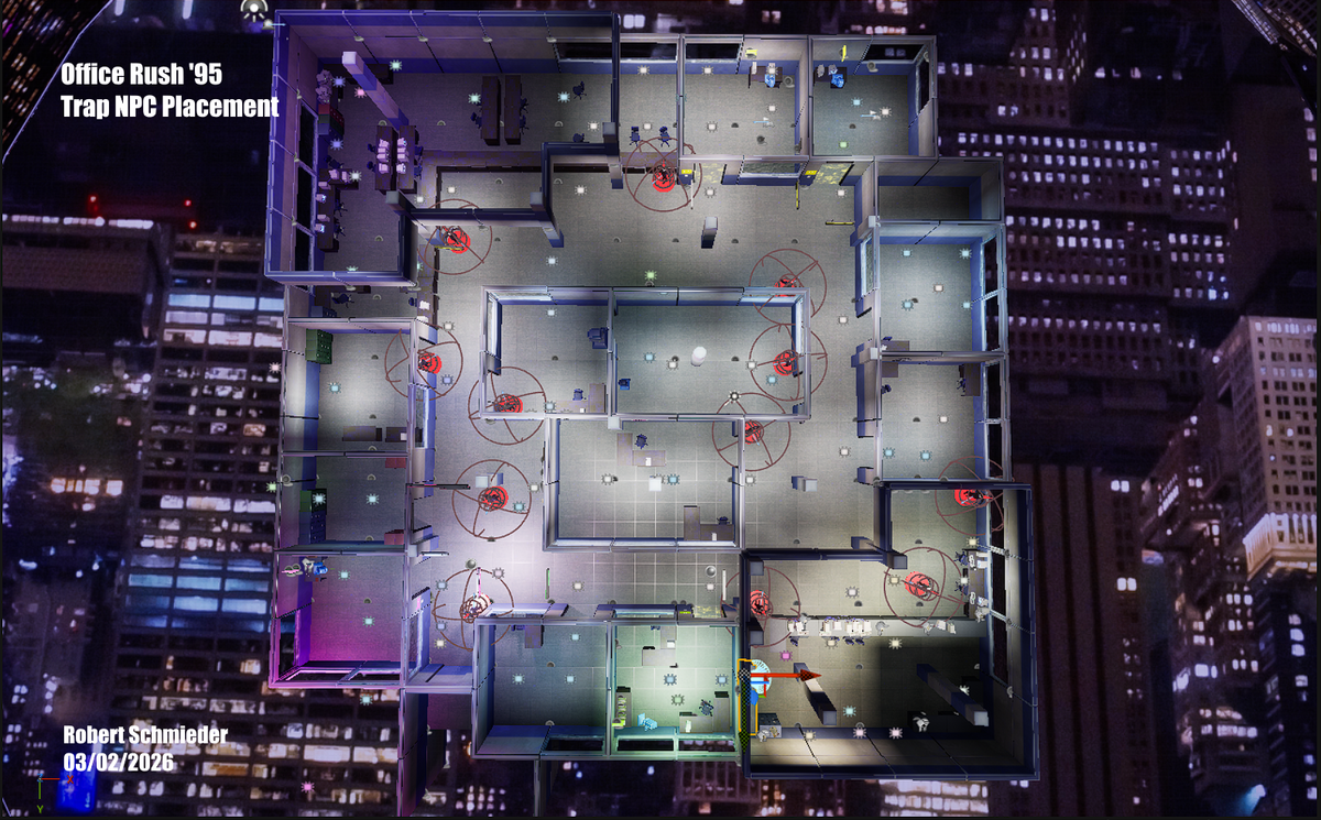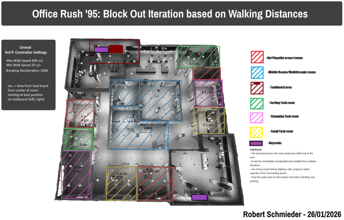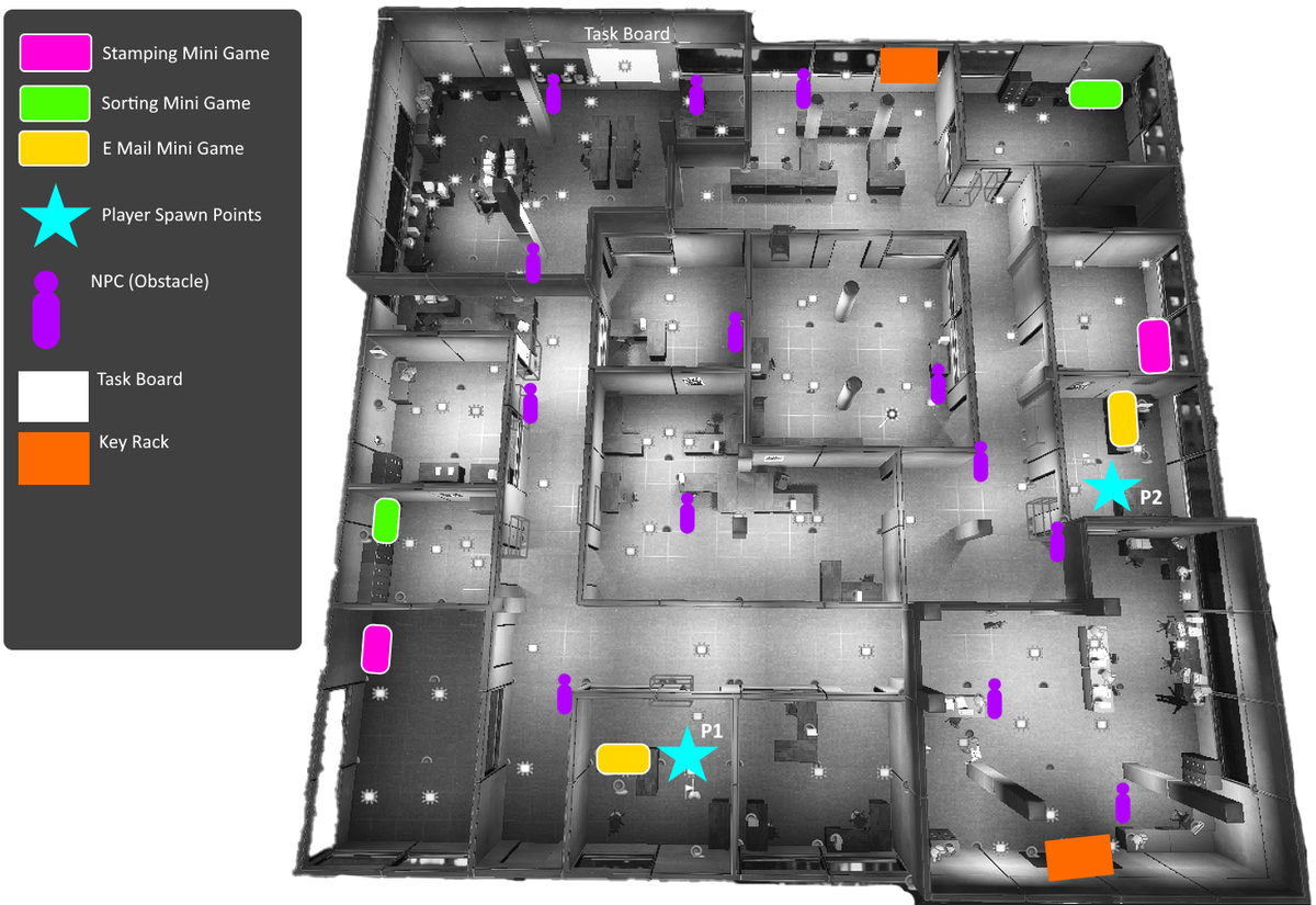 On this project I worked in conjunction with another Level Designer. The Lead Level Designer, Fedir Stepanenko, was responsible for layouting and blocking out the basic structure of the main level as well as establishing the level creation workflow whereas I was for responsible for the spatial arrangement of all of the interactive gameplay elements like mini game stations, visual clues for orientation and elements of sabotage like NPC-“Traps” and pickable keys for locking doors.