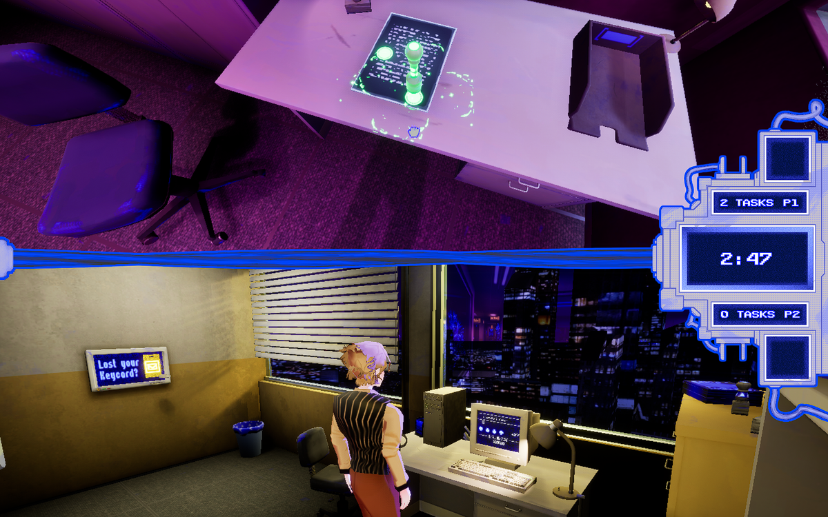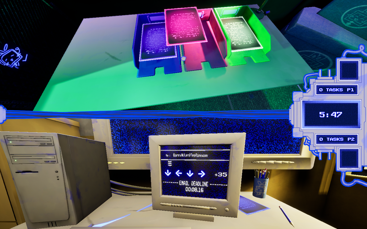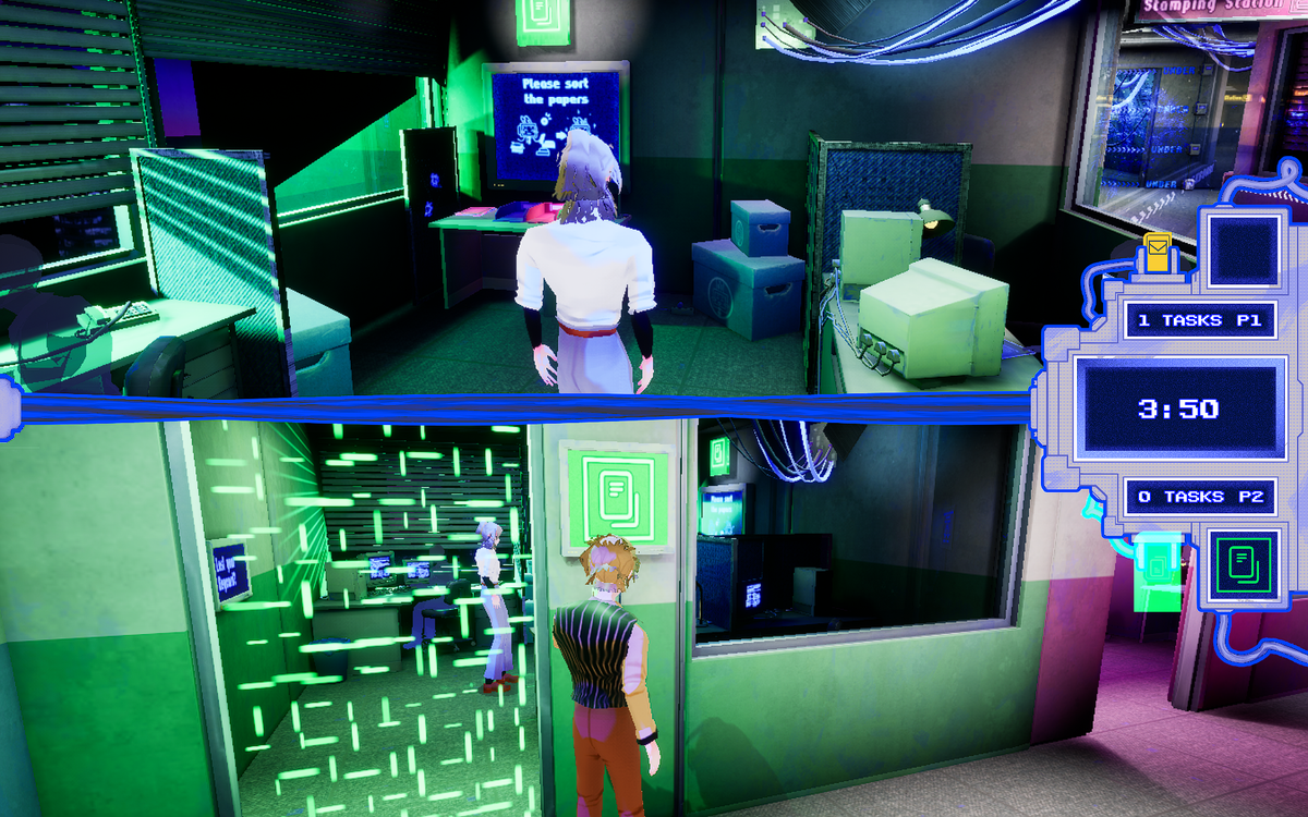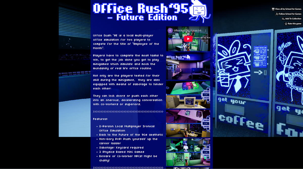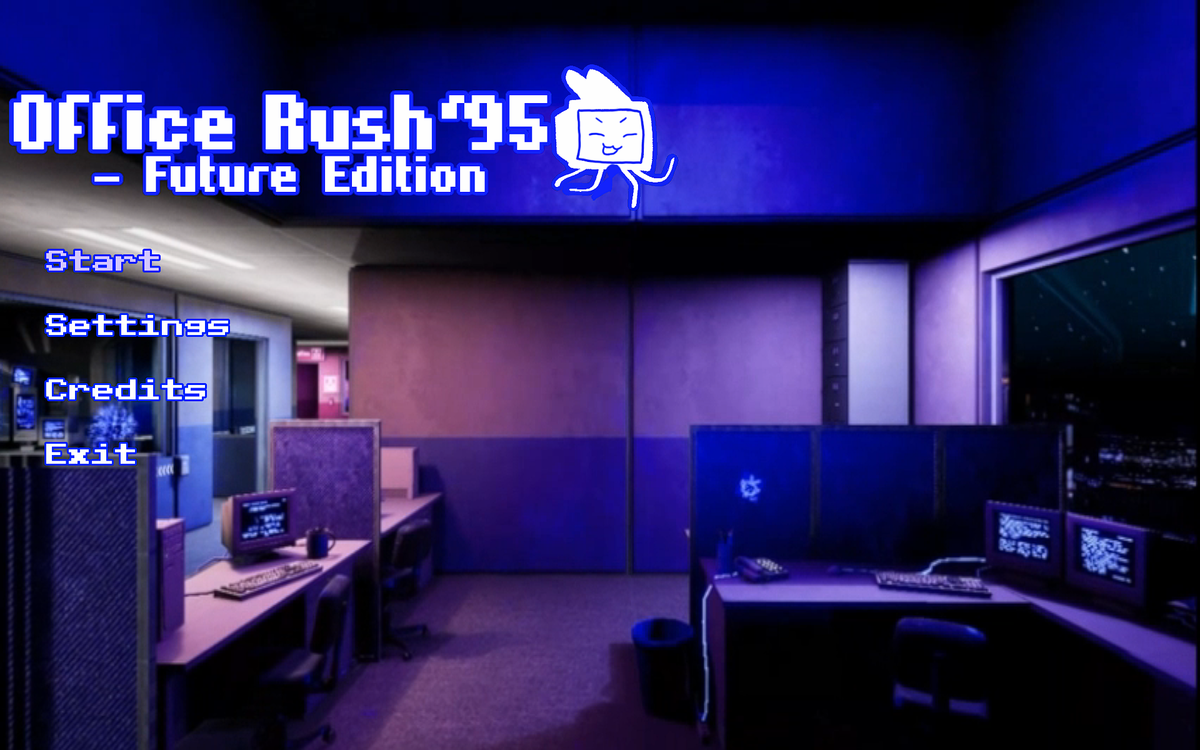 Office Rush ‘95 is a local multi-player office simulation in which the two players compete for the title of “Employee of the Month”. Players have to complete as many office task assignments as possible to win. To get the job done players get to play funny mini games which simulate and mock the mundanity of certain kinds of office tasks. Players are not only tested for their skill during the mini games they are also equipped with means of sabotage to impede the progress of the other player. They can lock doors for the other player or push each other into an onerous, decelerating conversation with co-workers or superiors.