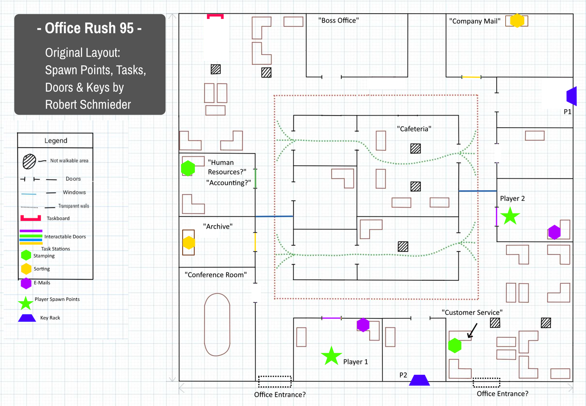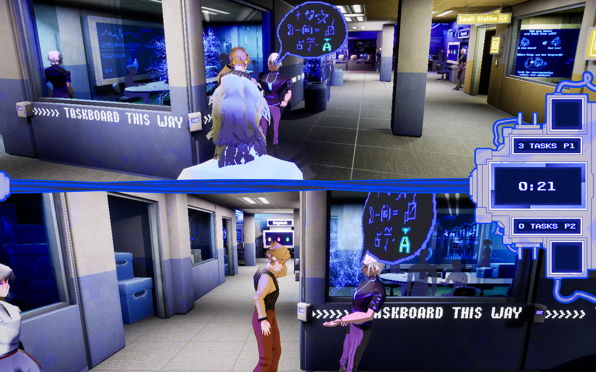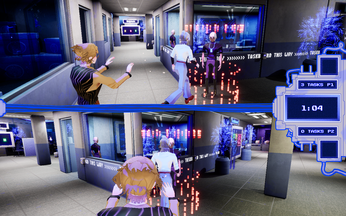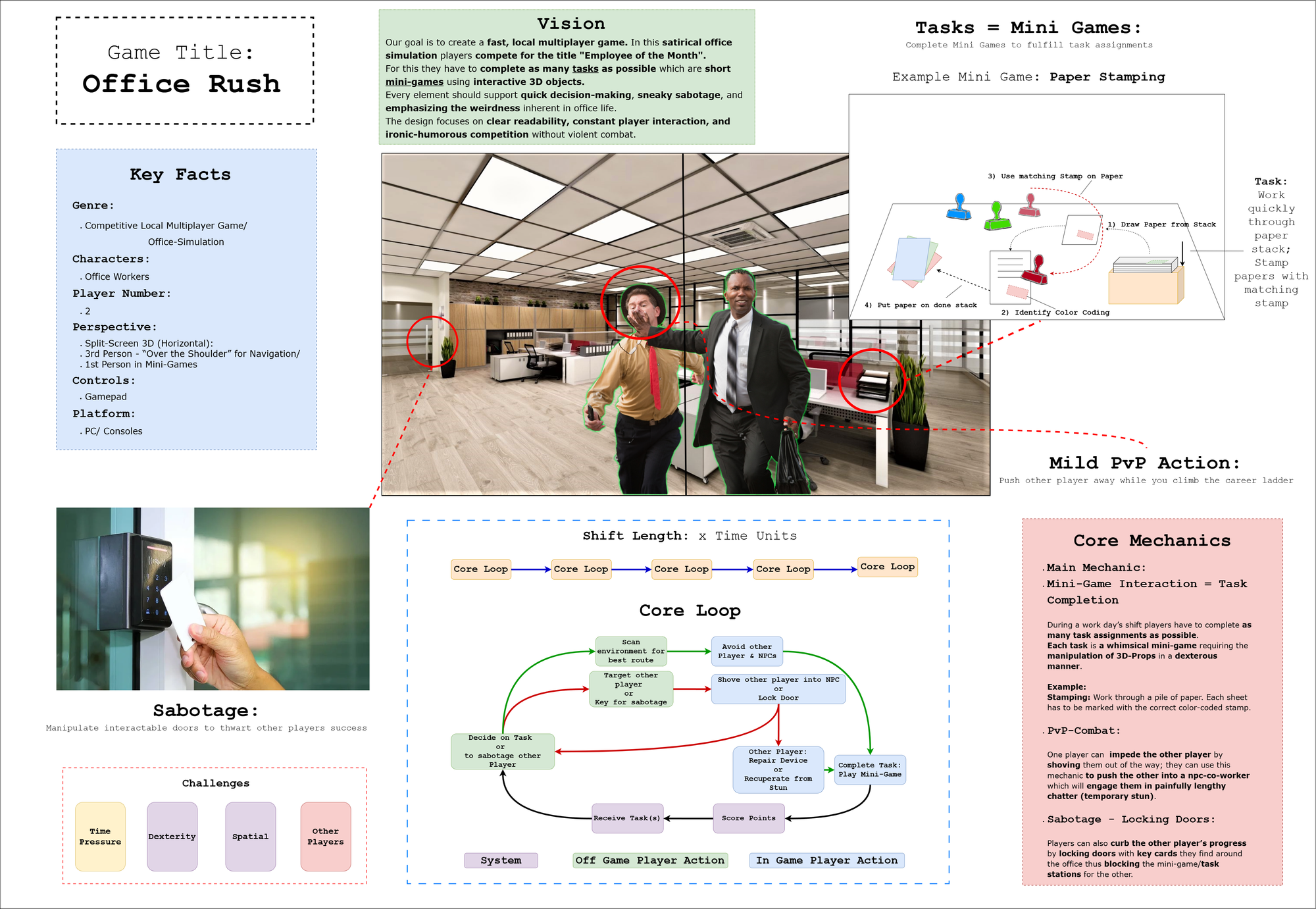 Office Rush ‘95 is a local multi-player office simulation in which the two players compete for the title of “Employee of the Month”. Players have to complete as many office task assignments as possible to win. To get the job done players get to play funny mini games which simulate and mock the mundanity of certain kinds of office tasks. Players are not only tested for their skill during the mini games they are also equipped with means of sabotage to impede the progress of the other player. They can lock doors for the other player or push each other into an onerous, decelerating conversation with co-workers or superiors.