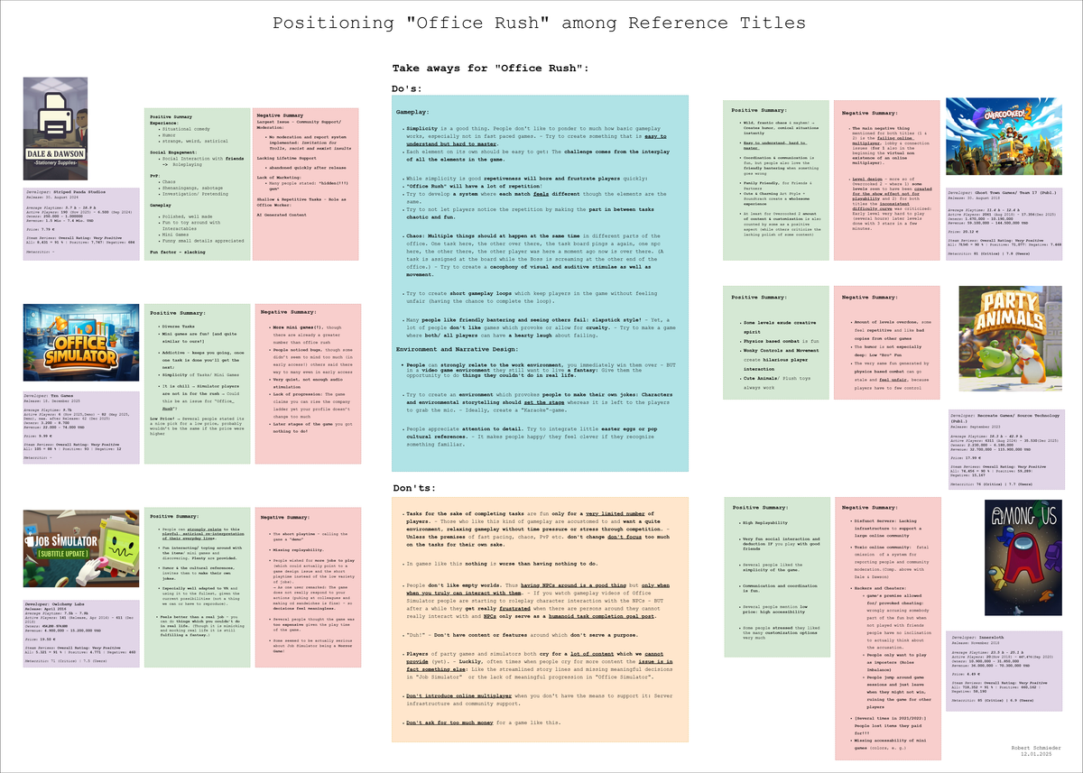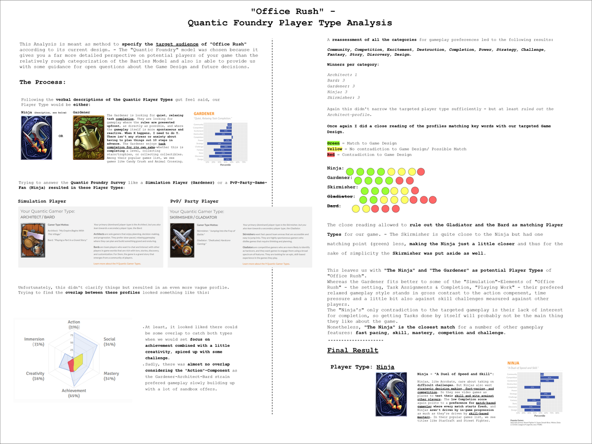 I was responsible for QA during Office Rush’s production. I wrote and conducted test cases for multiple scenarios on each detail of the games. I organized playtests with external testers, employed methods of direct observations, interviews and surveys. I protocolled and summarized the results for the team, communicated issues and presented possible solutions.