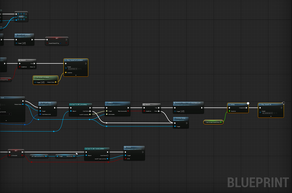 - Audio: On this project I was also responsible for getting the background music and sound effects into the game. That meant playing the right sound and type of sound from the right place in the existing scripts via Visual Scripting in Unreal.